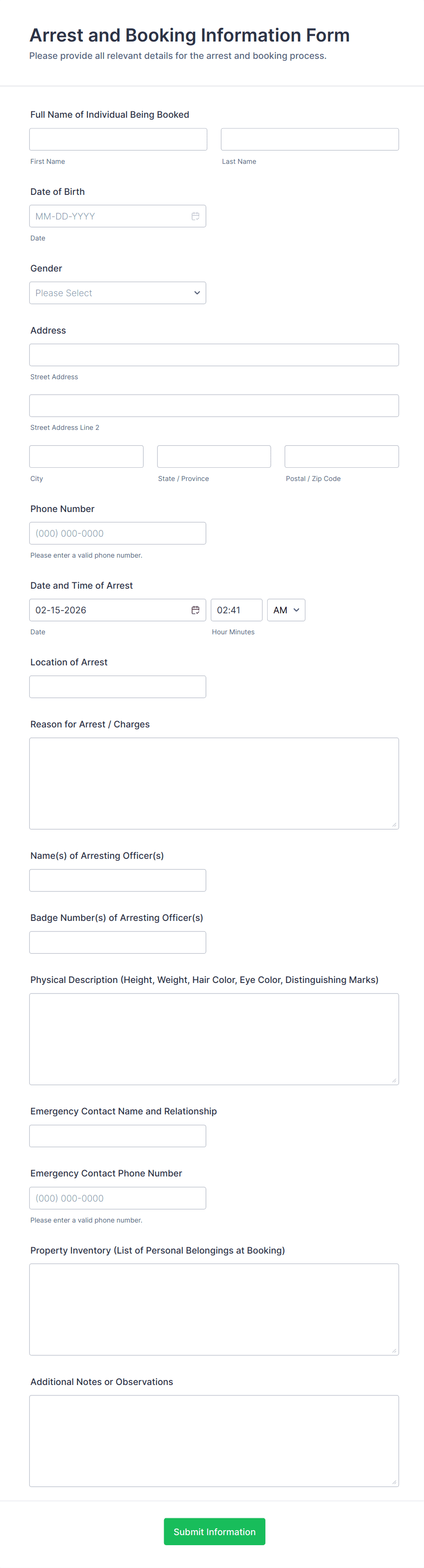 Arrest And Booking Information Form