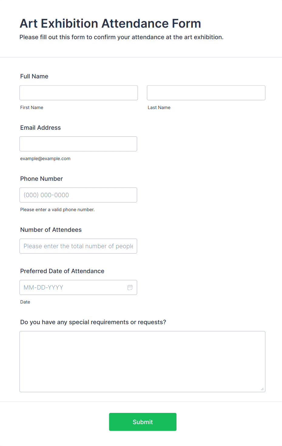 • Content and fields vary based on event type: For example, a conference form may include session selection and company details, while a wedding RSVP form might ask for meal preferences and plus-one information.
