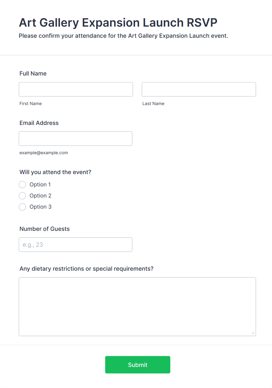 RSVP forms are digital tools designed to collect responses from invitees regarding their attendance at events, gatherings, meetings, or special occasions. Whether you’re organizing a wedding, corporate seminar, birthday party, or community event, RSVP forms streamline the process of confirming guest participation, gathering essential details like meal preferences, plus-ones, or special requirements. These forms help event organizers efficiently manage headcounts, plan logistics, and ensure a smooth experience for both hosts and attendees. The versatility of RSVP forms means they can be tailored for formal galas, casual get-togethers, virtual webinars, or even recurring club meetings.