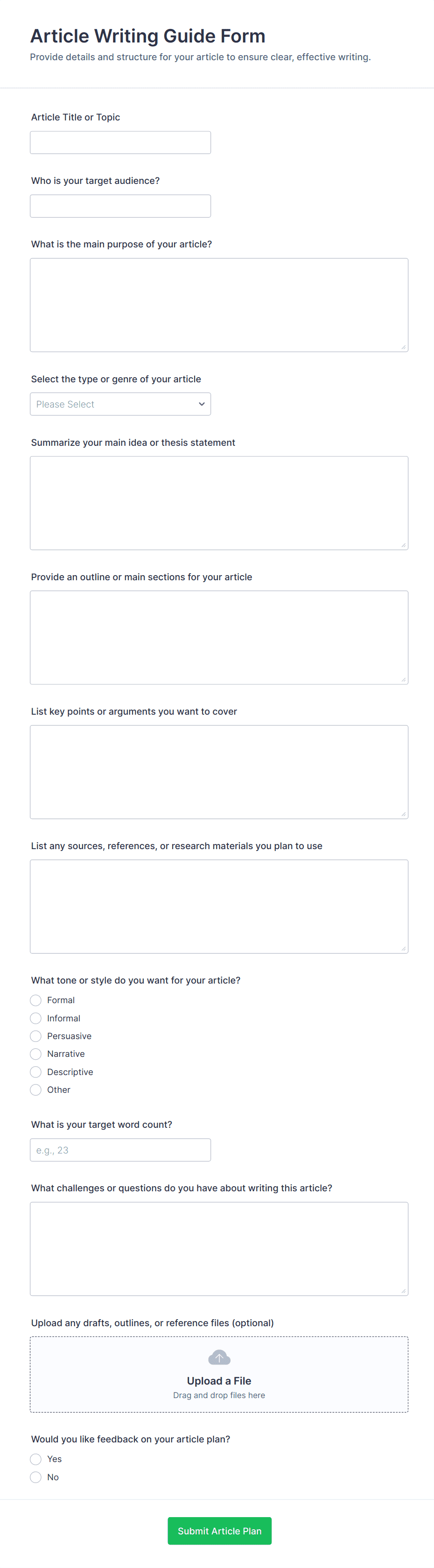 Content Forms are specialized online forms designed to facilitate the collection, submission, and management of various types of content. These forms are commonly used for gathering articles, blog posts, creative writing, multimedia files, user-generated content, feedback, and editorial submissions. Organizations, publishers, marketing teams, and educators often rely on Content Forms to streamline the process of receiving and organizing content from contributors, freelancers, or the public. Whether you’re running a magazine, managing a content marketing campaign, or collecting student assignments, Content Forms help ensure that submissions are structured, complete, and easy to review.