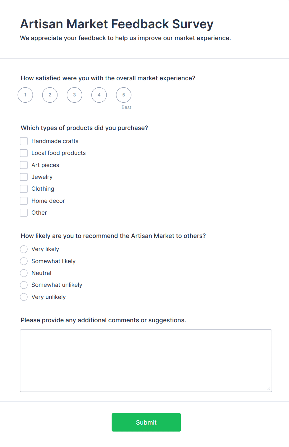 - Open-ended comment boxes for suggestions and detailed feedback