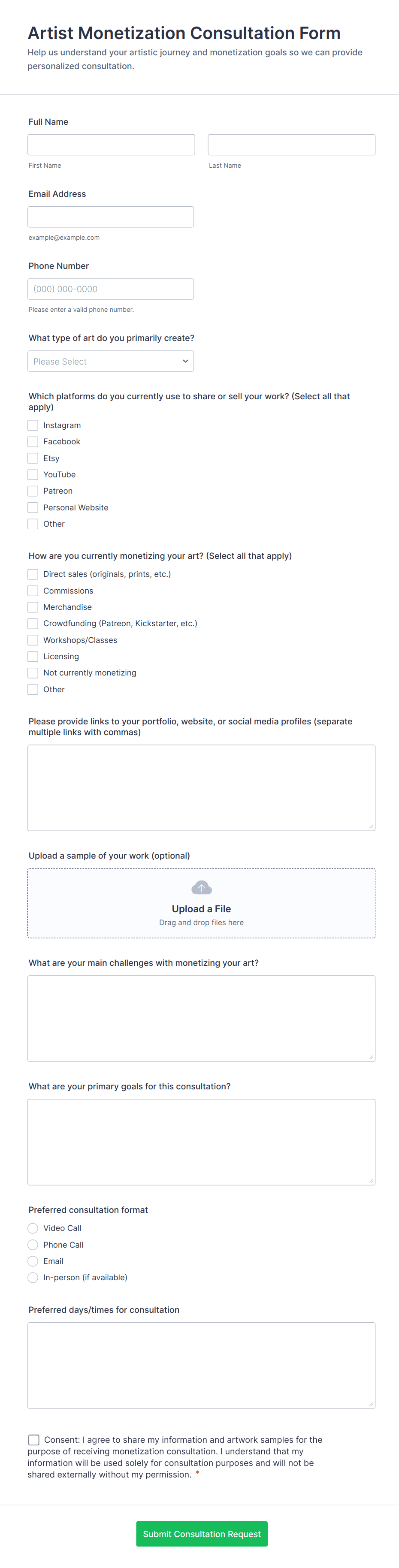 In summary, consulting forms are versatile tools that can be tailored to various consulting scenarios, helping professionals deliver organized, efficient, and client-focused services.