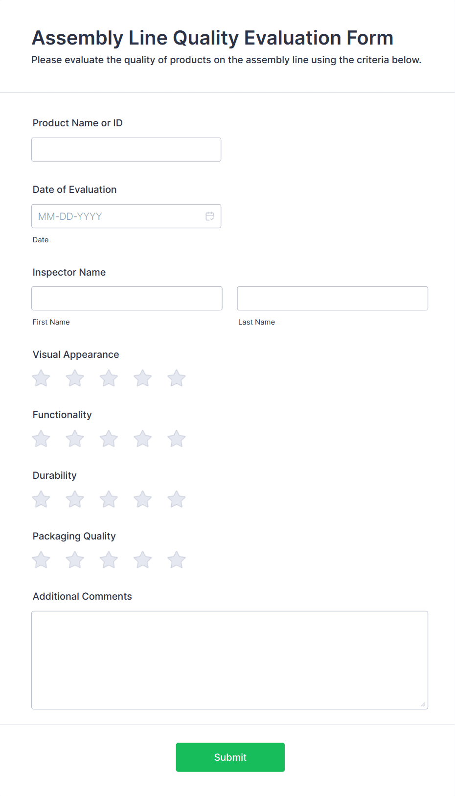 - File upload fields for supporting documentation (useful in audits or supplier evaluations).