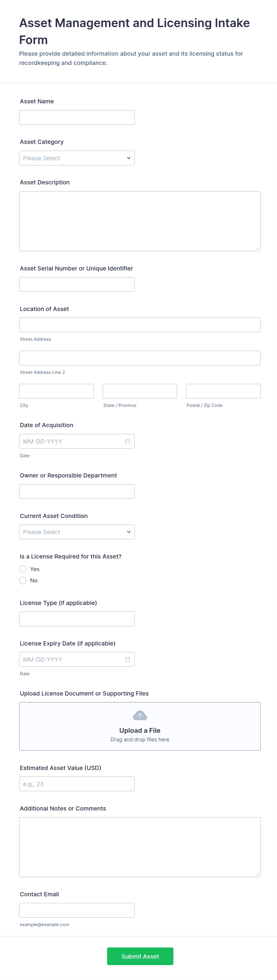 Asset Tracking Forms are specialized digital tools designed to help organizations monitor, record, and manage their physical or digital assets efficiently. These forms are commonly used to log details about equipment, inventory, vehicles, IT hardware, or any valuable property, ensuring that assets are accounted for throughout their lifecycle. Typical use cases include tracking asset check-ins and check-outs, scheduling maintenance, recording asset conditions, and managing asset assignments to employees or departments. By centralizing asset information, these forms help reduce loss, improve accountability, and streamline audits or compliance processes.
