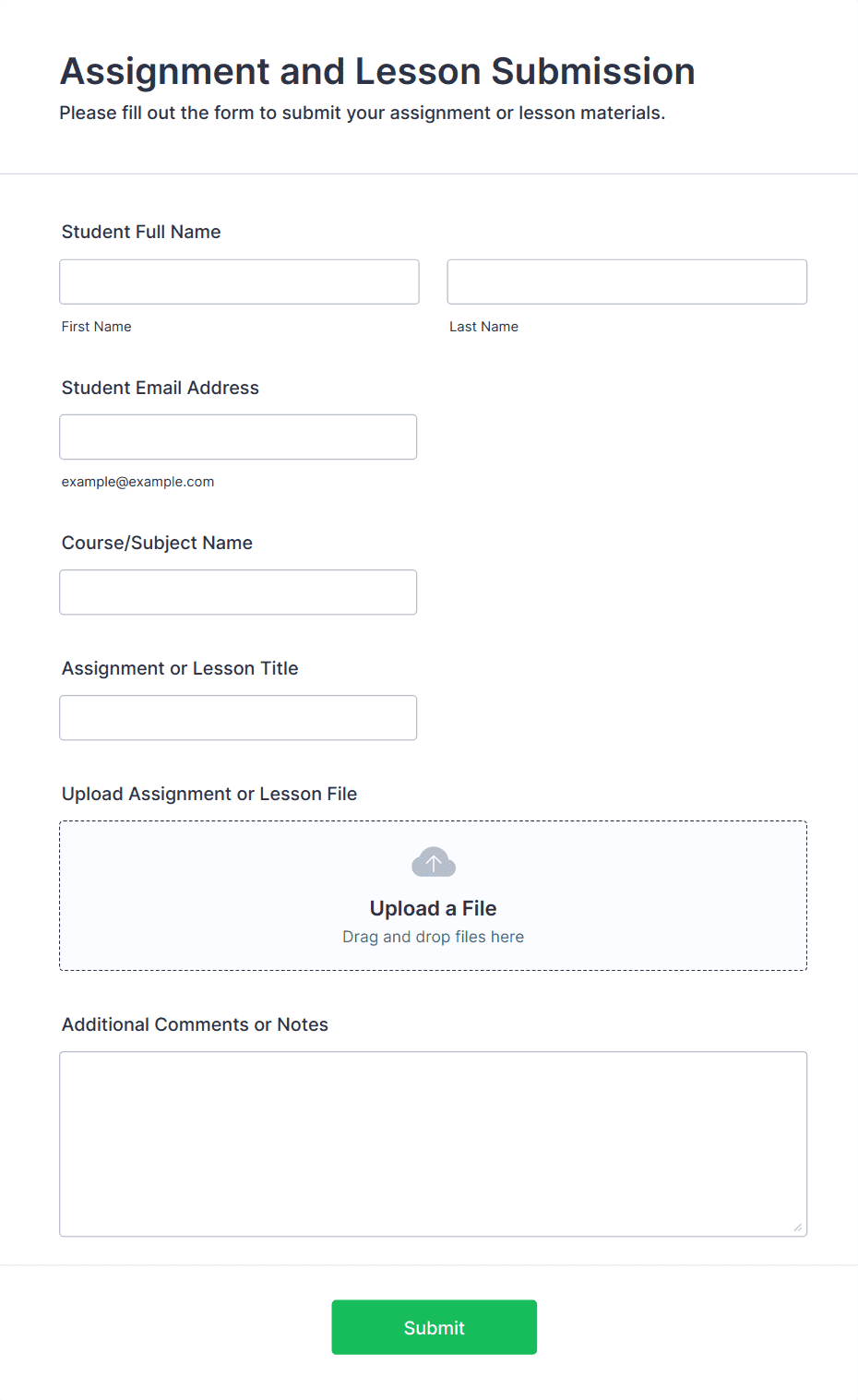 • Assignment Submissions: Include fields for course name, assignment title, and student ID.