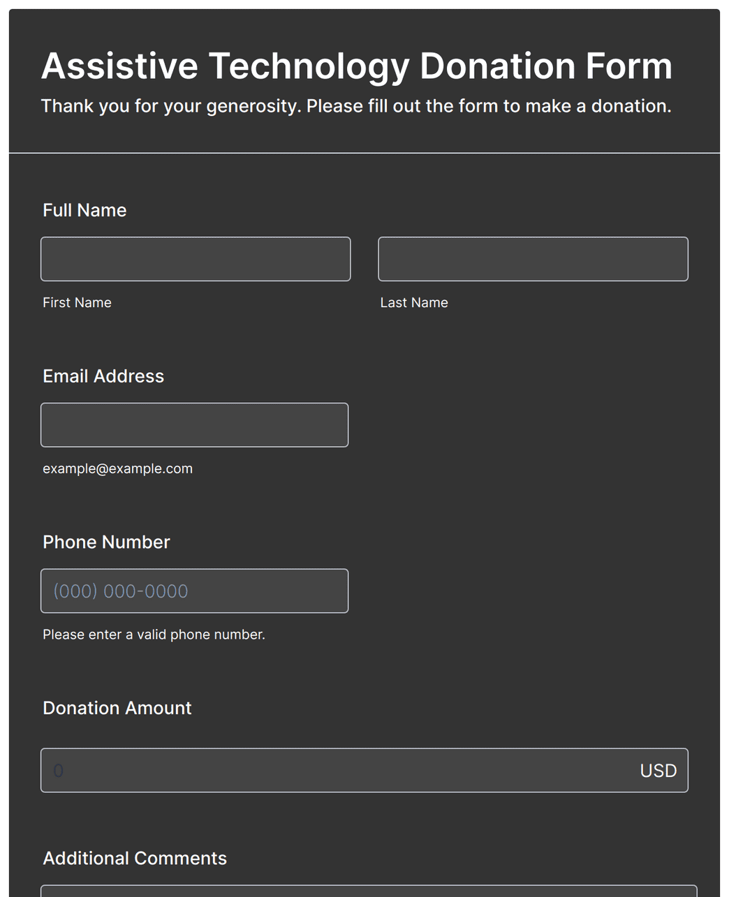 • Donation amount (with options for preset amounts or custom entry)