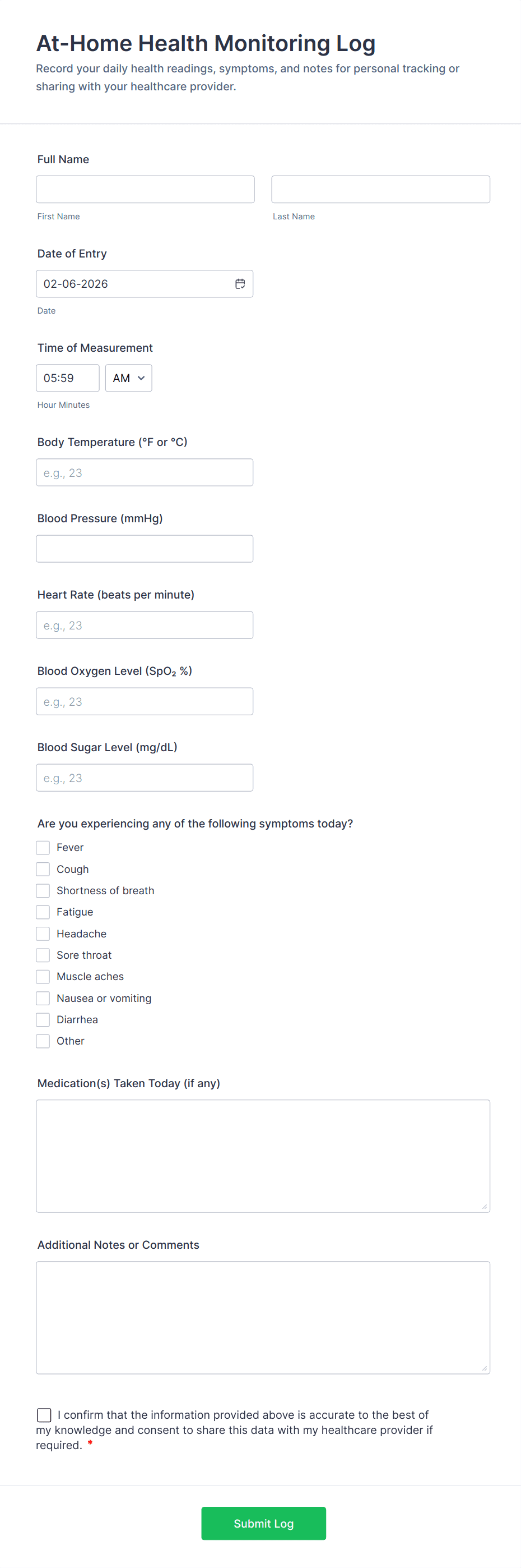Health Tracking Forms are digital tools designed to help individuals, healthcare professionals, and organizations monitor, record, and analyze various aspects of health and wellness. These forms can be used for a wide range of purposes, such as tracking daily symptoms, monitoring medication adherence, recording vital signs, logging exercise routines, or managing chronic conditions. Whether you’re a patient managing your own health, a caregiver supporting someone else, or a medical professional overseeing multiple patients, Health Tracking Forms provide a structured and efficient way to collect and review important health data over time.
