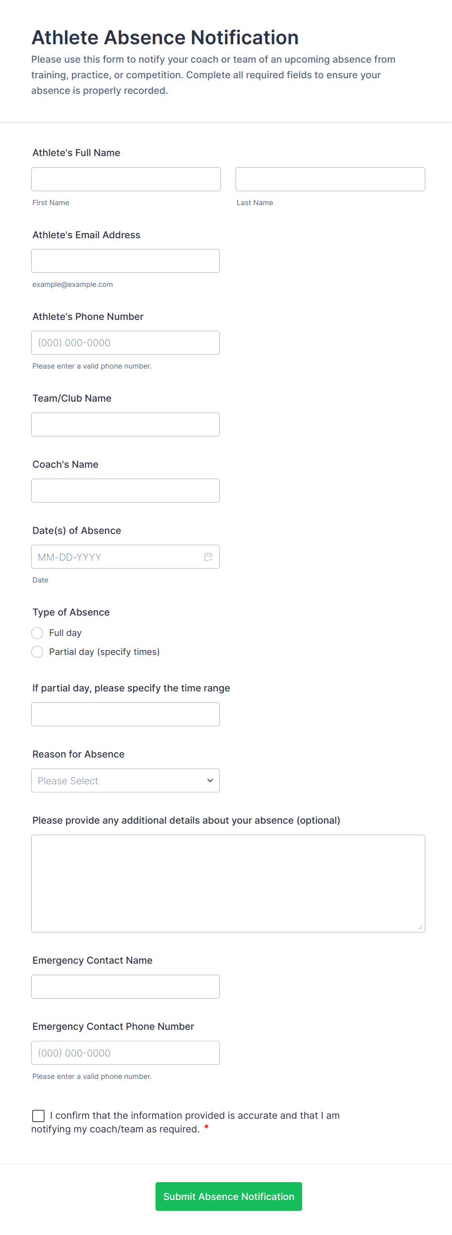 - Custom Fields: Student/employee ID, department/class, reason for absence, or session selection.