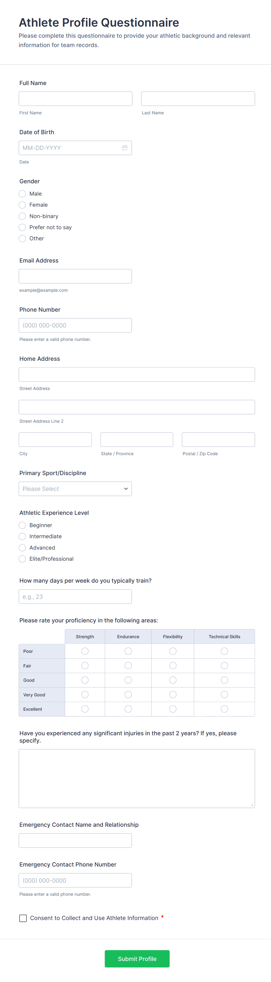 Common fields include athlete’s name, date of birth, contact details, emergency contacts, medical history, allergies, insurance information, consent signatures, and event or team preferences.