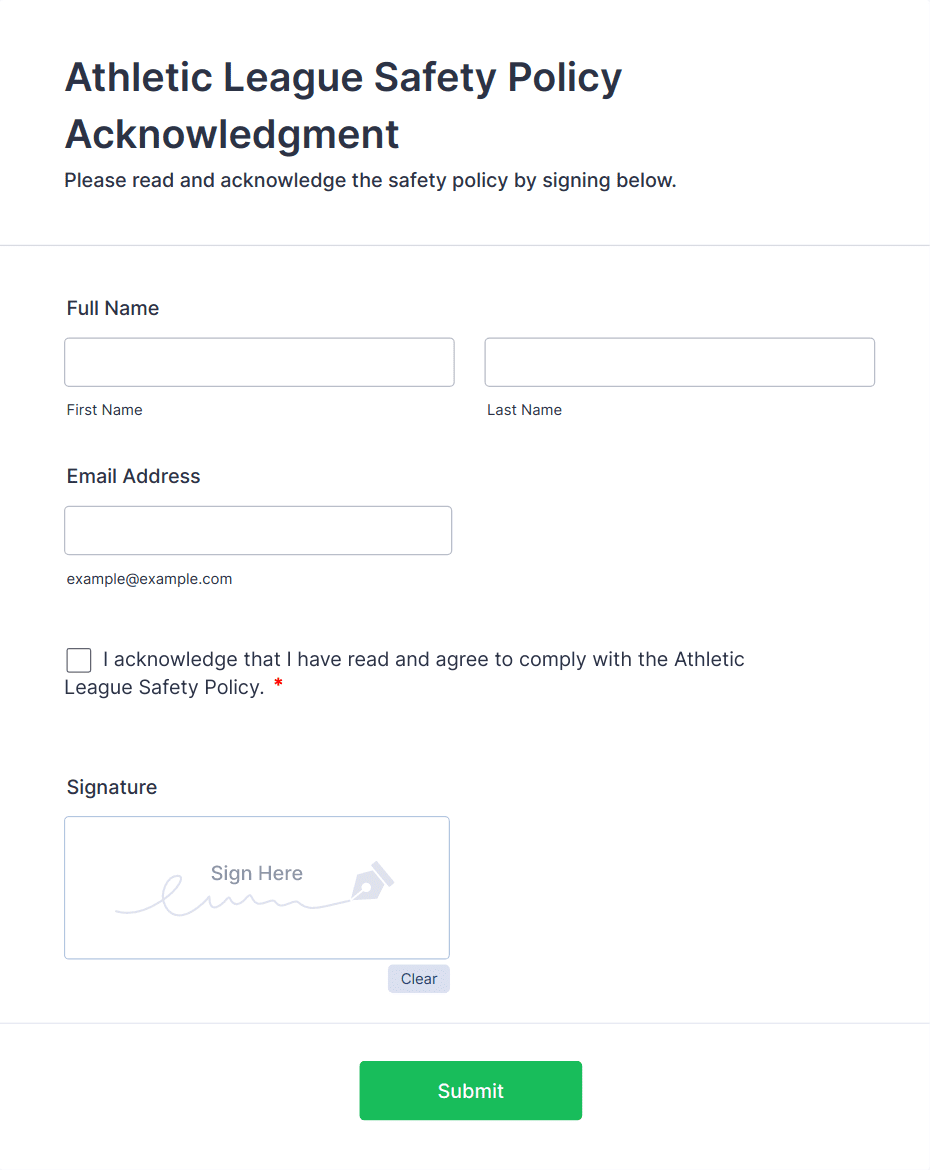 Want to spend more time on the field and less time organizing your team’s information? Easily collect your sports team’s registrations, scholarship applications, or performance evaluations with free Athlete Forms from Jotform. Choose one of our many templates and start customizing with our easy to use no-code drag-and-drop builder. Upload your team’s logo, choose fonts and colors, and integrate your form with 100+ third-party platforms in just a few easy clicks. Share your form to your team directly or embed it in your website in seconds. Up your form game with powerful Athlete Forms from Jotform.