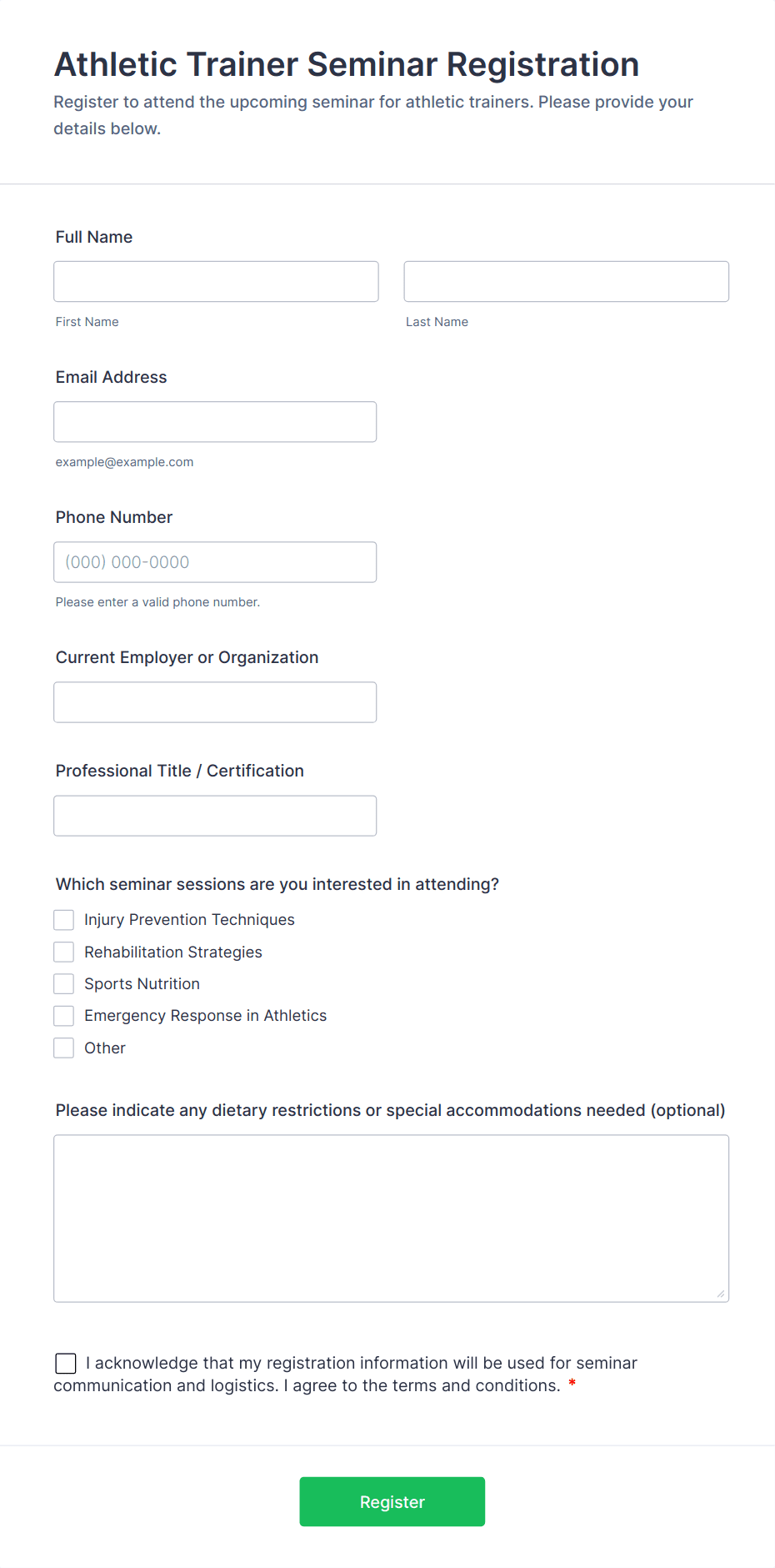 Common fields include attendee name, email, phone number, payment details (if applicable), session or activity selection, dietary restrictions, and special accommodations.