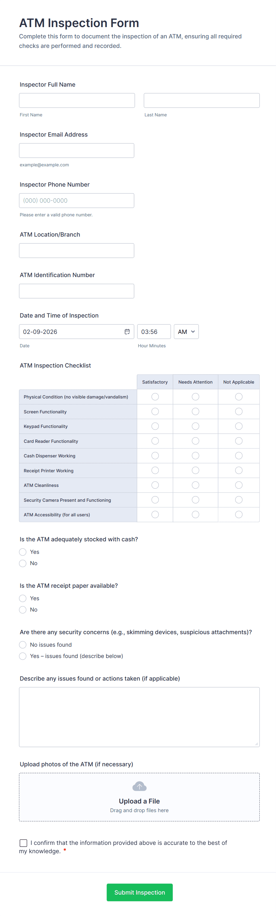- For construction inspections, add fields for equipment status, safety compliance checklists, and supervisor sign-off.