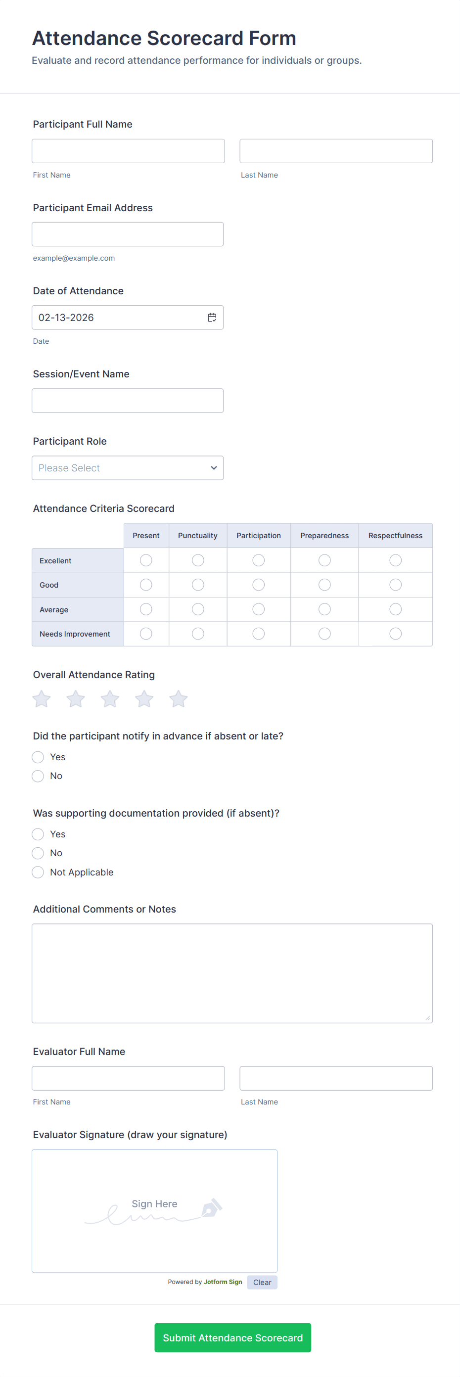 An Attendance Form is a versatile form template designed to facilitate event attendance tracking, employee attendance logging, student attendance records, training and onboarding tracking, volunteer attendance management, and fitness and sports attendance