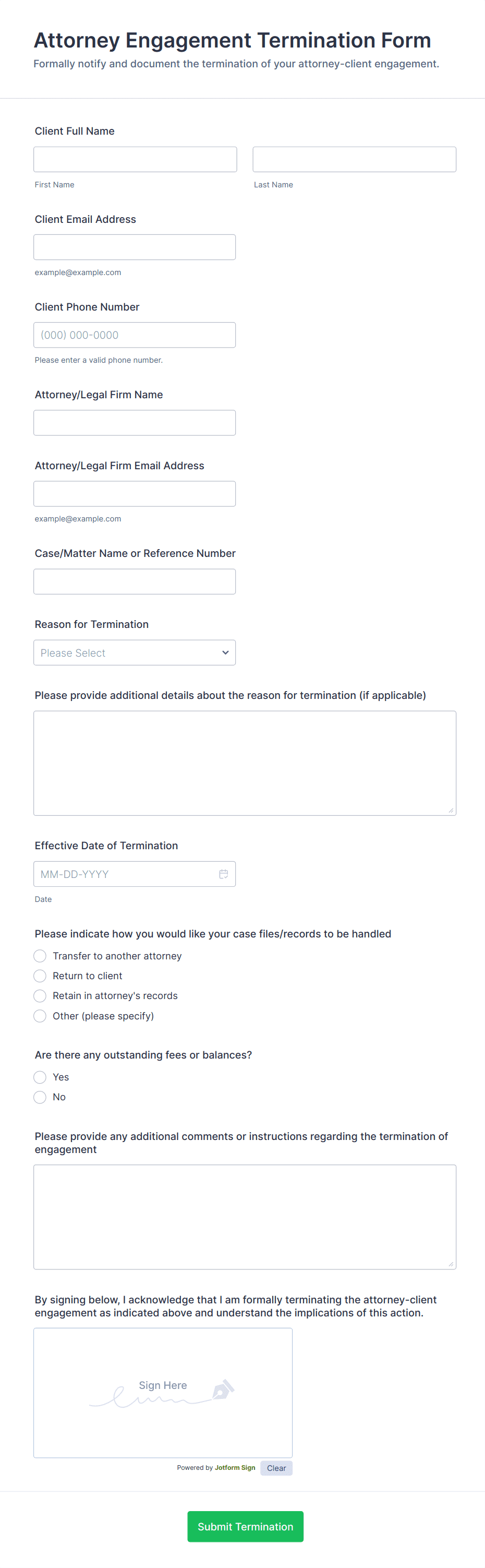 The form templates here are for informational purposes only. Jotform is not providing legal, financial, or other advice, or implying that the forms are legally valid in all or any jurisdictions. Before using any such form, consult an attorney and/or other applicable professionals to make sure that the form meets your needs, legally and otherwise.