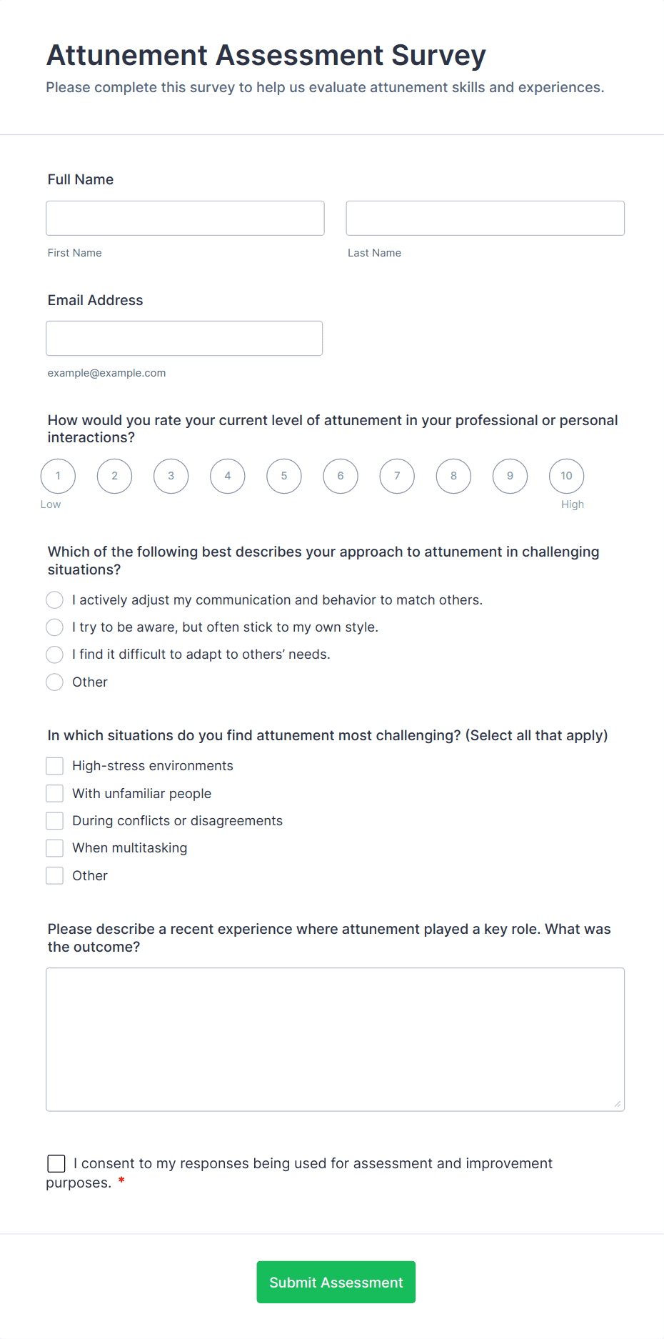 Assessment forms may include personal details, multiple-choice or open-ended questions, rating scales, comment sections, and sometimes automated scoring or feedback fields, depending on the purpose.