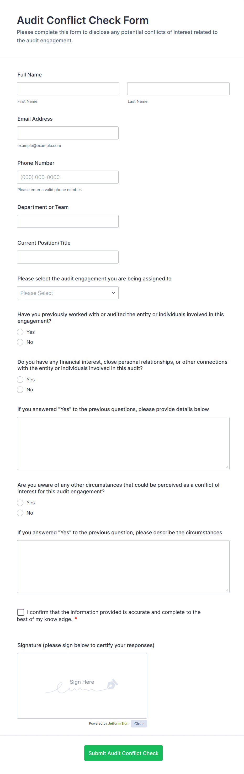 Jotform ensures that all form submissions are securely stored and can be accessed only by authorized users. Additional privacy features, such as encryption and access controls, help protect sensitive audit data.