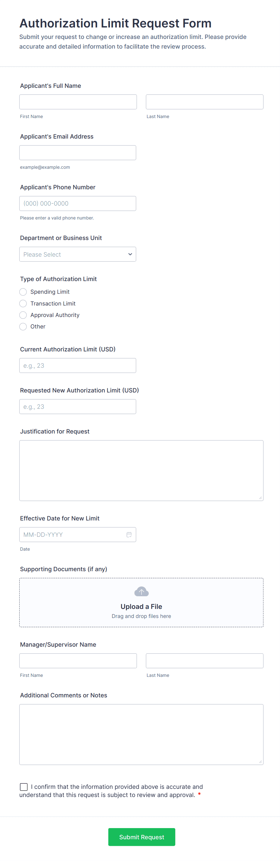 Authorization Form Templates are specialized documents designed to capture formal consent or permission from individuals or organizations for a wide range of activities. These forms are commonly used to authorize actions such as releasing medical records, processing payments, granting access to confidential information, or allowing participation in specific programs or events. By providing a clear, legally recognized record of consent, authorization forms help organizations comply with regulations, protect privacy, and ensure that all parties understand the scope and limitations of the permission being granted. Typical use cases include healthcare providers seeking patient consent, businesses processing recurring payments, schools obtaining parental approval, and HR departments managing employee permissions.