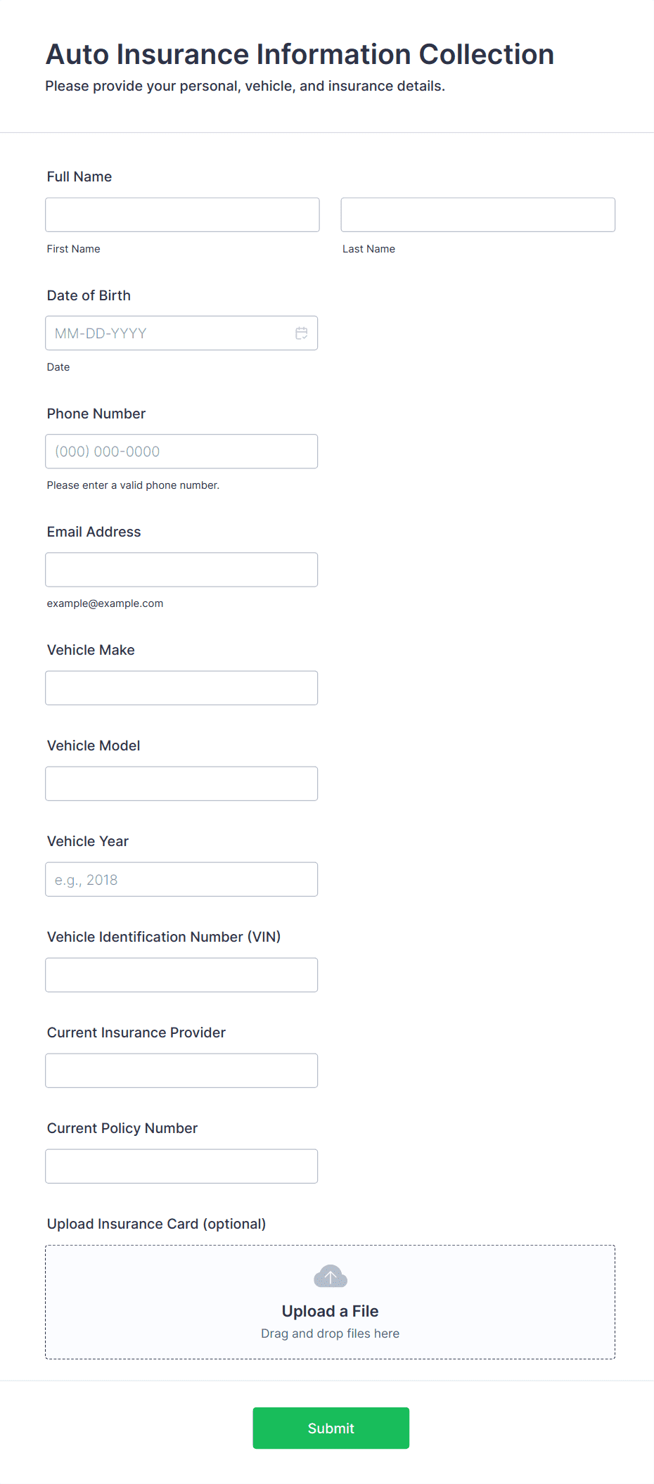 Use this form template when onboarding new auto insurance clients, requesting updates to existing policies, pre-qualifying leads from your website, or collecting information before renewal reviews.