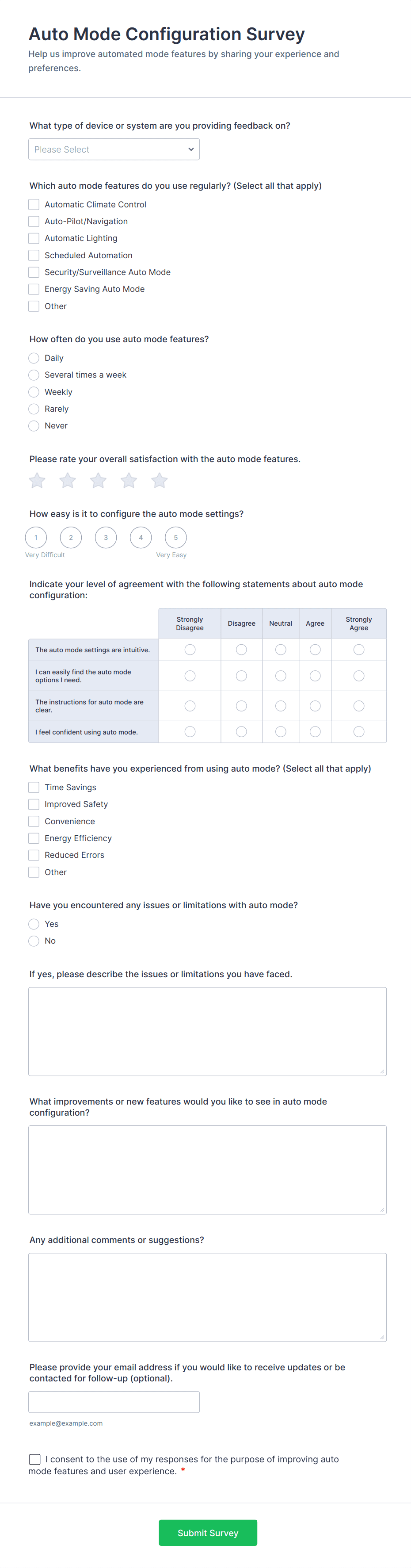 AI Agent Chat Interaction Feedback Form helps product and support teams collect user satisfaction scores and comments about AI chats, turning feedback into insights to improve AI experiences.