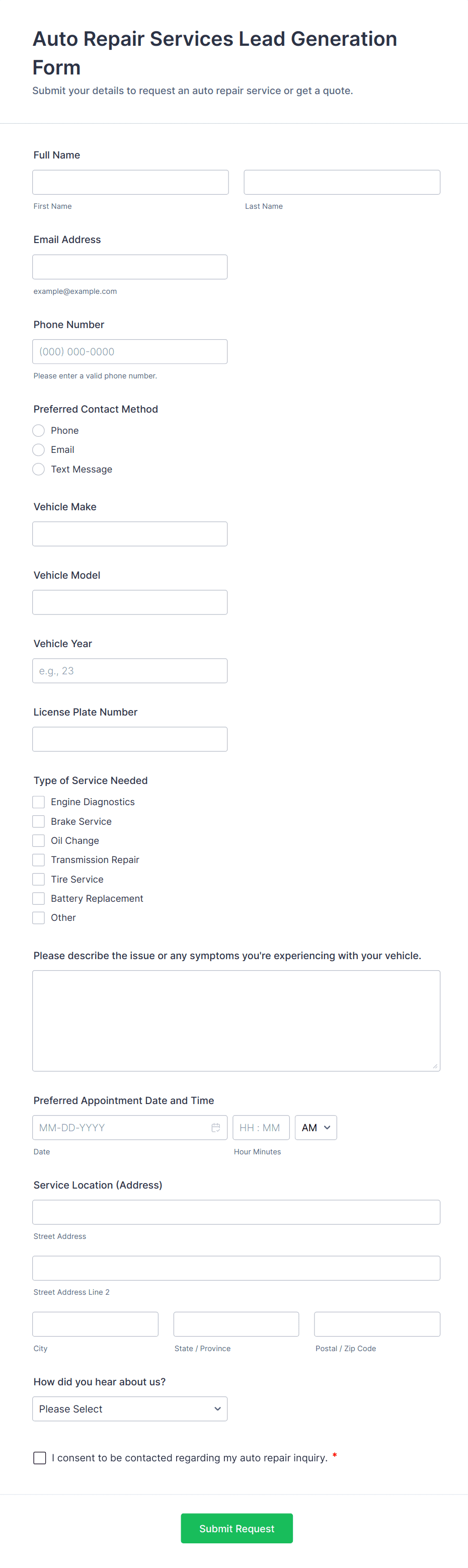 The information you collect depends on your goals, but common fields include name, email address, phone number, company, job title, and specific questions related to your product or service.