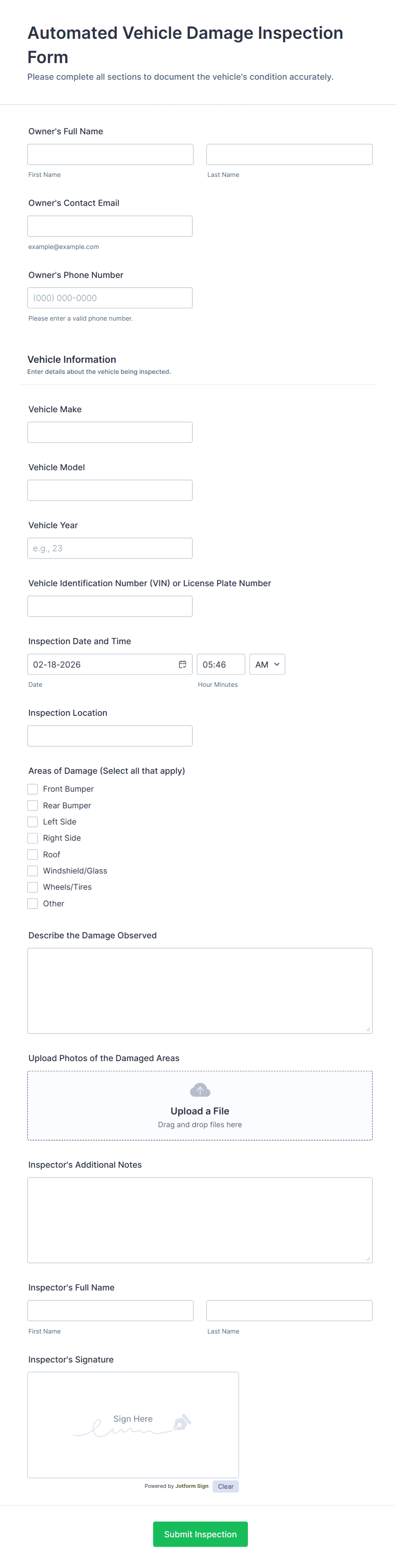 With Jotform, users can easily create, customize, and manage Vehicle Inspection Forms online without any coding knowledge. Leveraging Jotform’s intuitive drag-and-drop Form Builder, users can add fields for vehicle details, inspection checklists, photos, signatures, and more. The platform’s extensive template library and integration options streamline the data collection process, making it simple to store, organize, and share inspection results. Whether you’re managing a large fleet or conducting occasional inspections, Jotform’s features ensure efficient, accurate, and accessible vehicle inspection workflows.