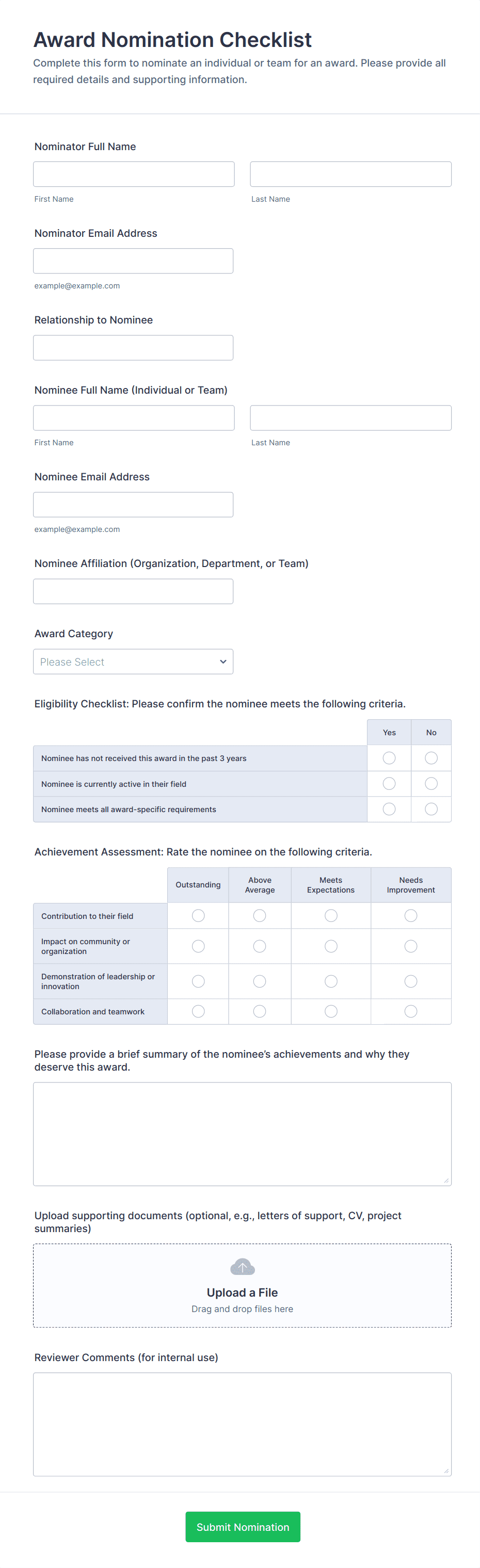 Common fields include nominee details, nomination category, justification aligned to criteria, supporting examples, and attachments or references.