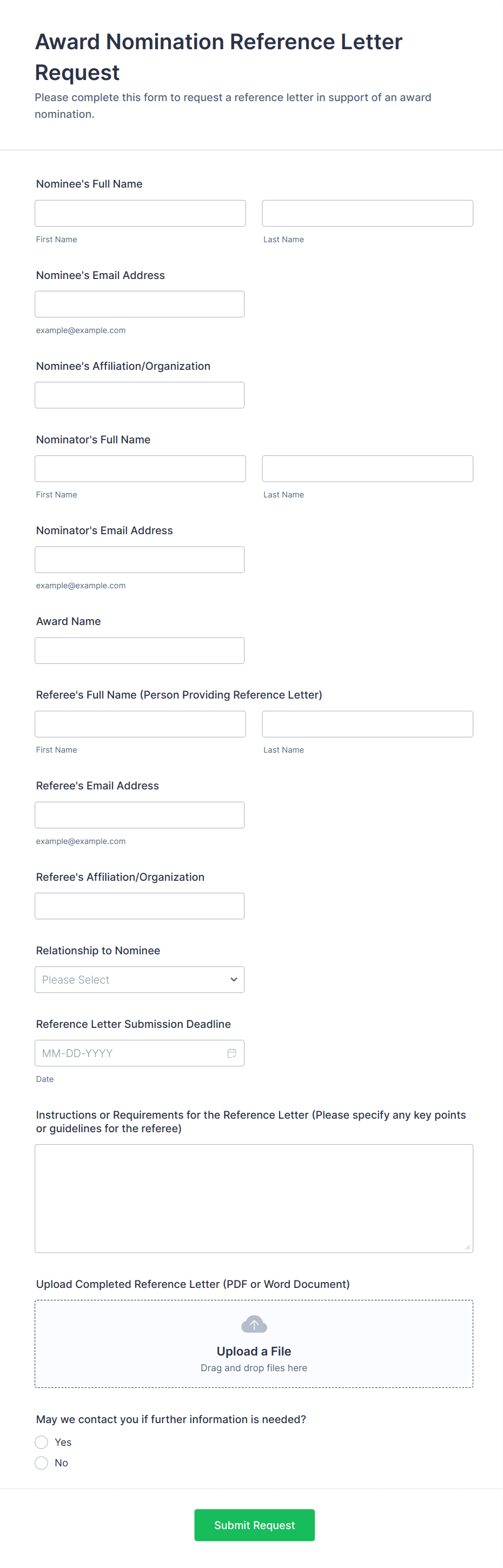 Collect nominee name, role or affiliation, and contact details if needed. Add nominator details and relationship to nominee.