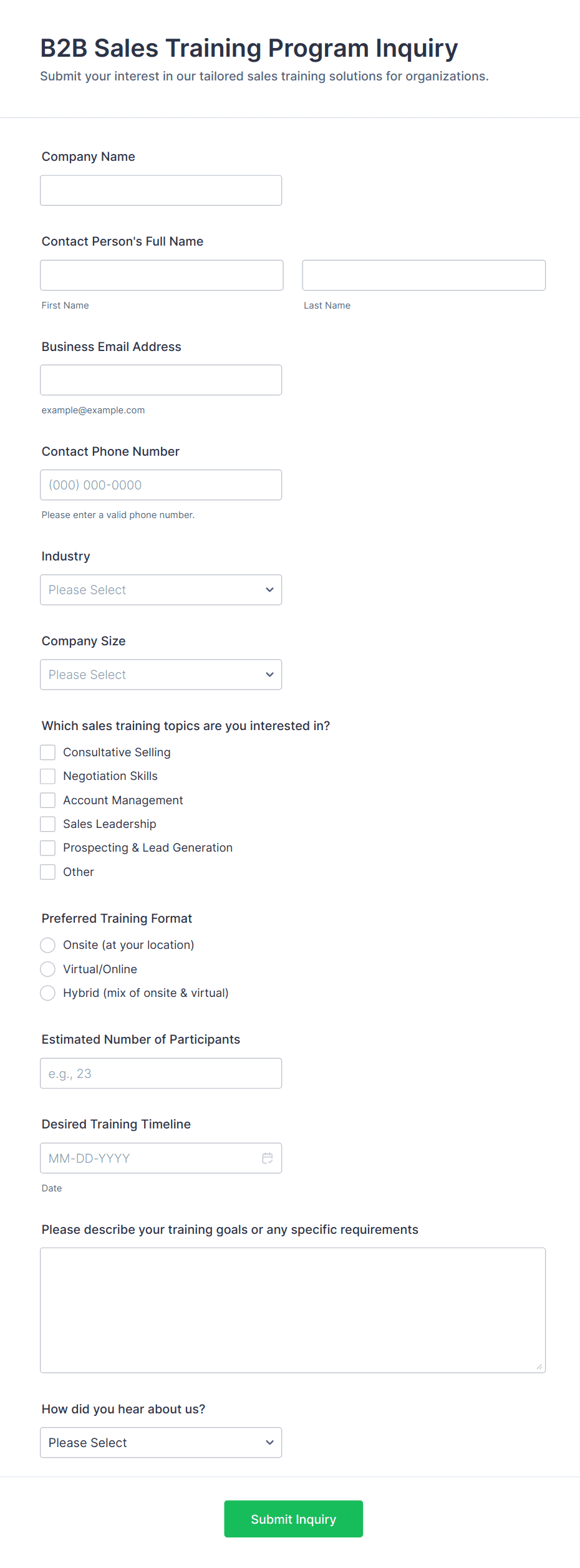 - Sales inquiry forms might request company name, budget, and specific interests