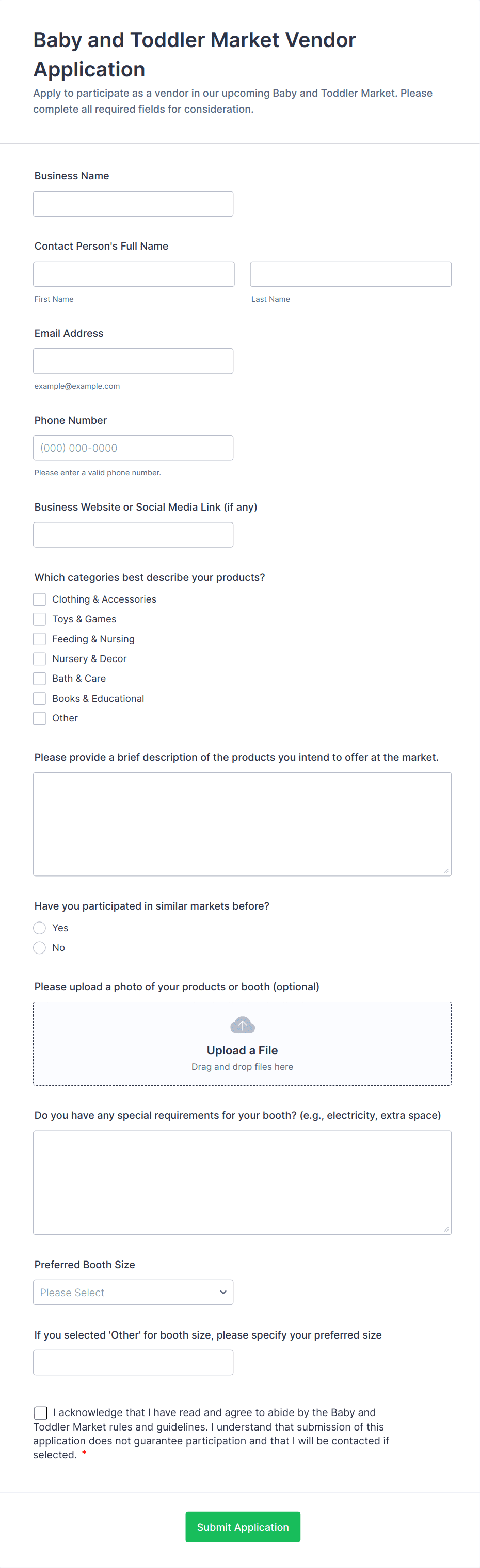 Vendor Application Form Templates are specialized online forms designed to streamline the process of onboarding new vendors, suppliers, or service providers for businesses and organizations. These templates help collect essential information such as company details, contact information, product or service offerings, certifications, compliance documents, and references. Vendor application forms are commonly used by procurement teams, event organizers, marketplaces, and retail businesses to evaluate and approve potential vendors efficiently. Whether you’re managing a large-scale event, sourcing new suppliers for your business, or running a marketplace that requires vendor vetting, these templates provide a structured and consistent way to gather and review applications.