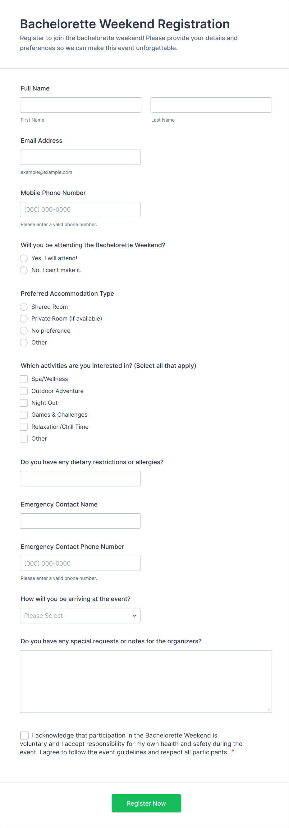 • For casual gatherings, a simple yes/no attendance field and contact information may suffice.