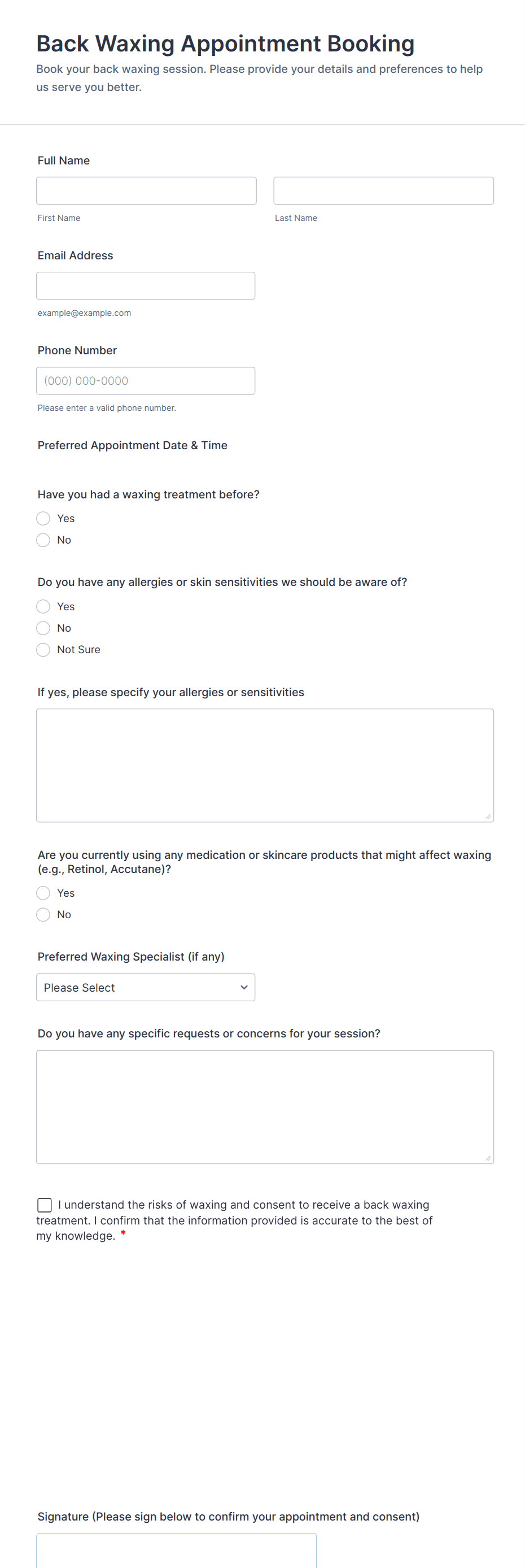 Free template for waxing salons. Book appointments easily. Get e-signatures. Easy to customize and embed. 100+ integrations, including Google Calendar. No coding.