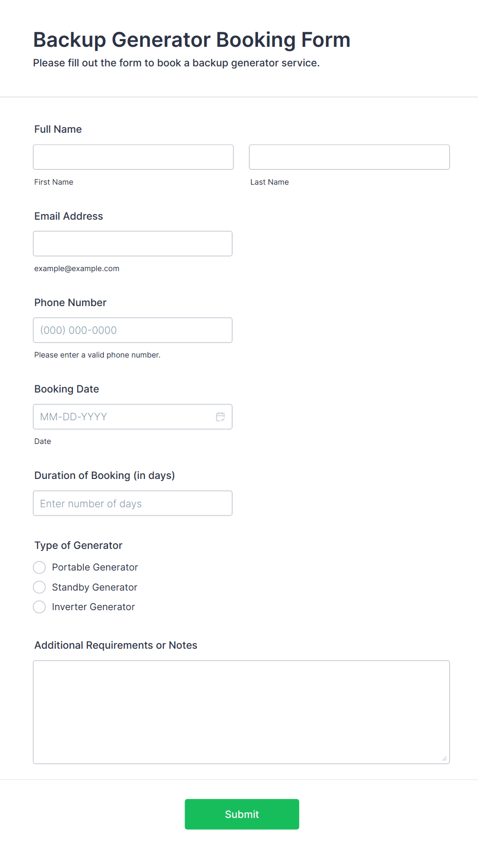 Booking forms are digital tools designed to streamline the process of scheduling appointments, reserving services, or booking resources. They are commonly used across a variety of industries, including hospitality, healthcare, education, event management, and personal services. Whether you’re managing hotel room reservations, client appointments, event registrations, or equipment rentals, booking forms help automate the intake of essential information, reduce manual errors, and ensure a smooth experience for both service providers and customers. Typical use cases include booking consultations, reserving meeting rooms, scheduling classes, or securing tickets for events.