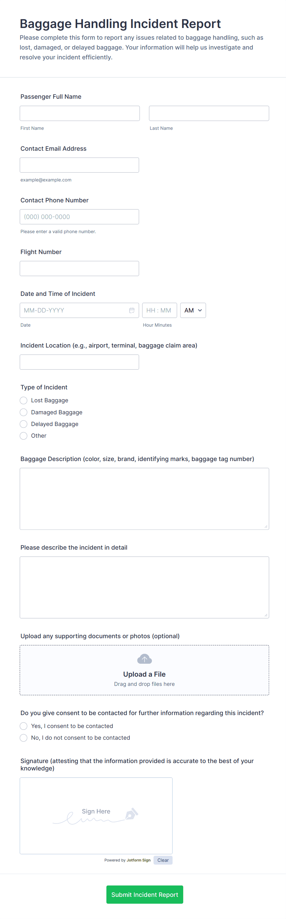 Transportation Incident Form templates in Jotform are ready-to-use digital forms that help teams report accidents, near misses, injuries, cargo damage, and other transportation-related incidents in a consistent format.