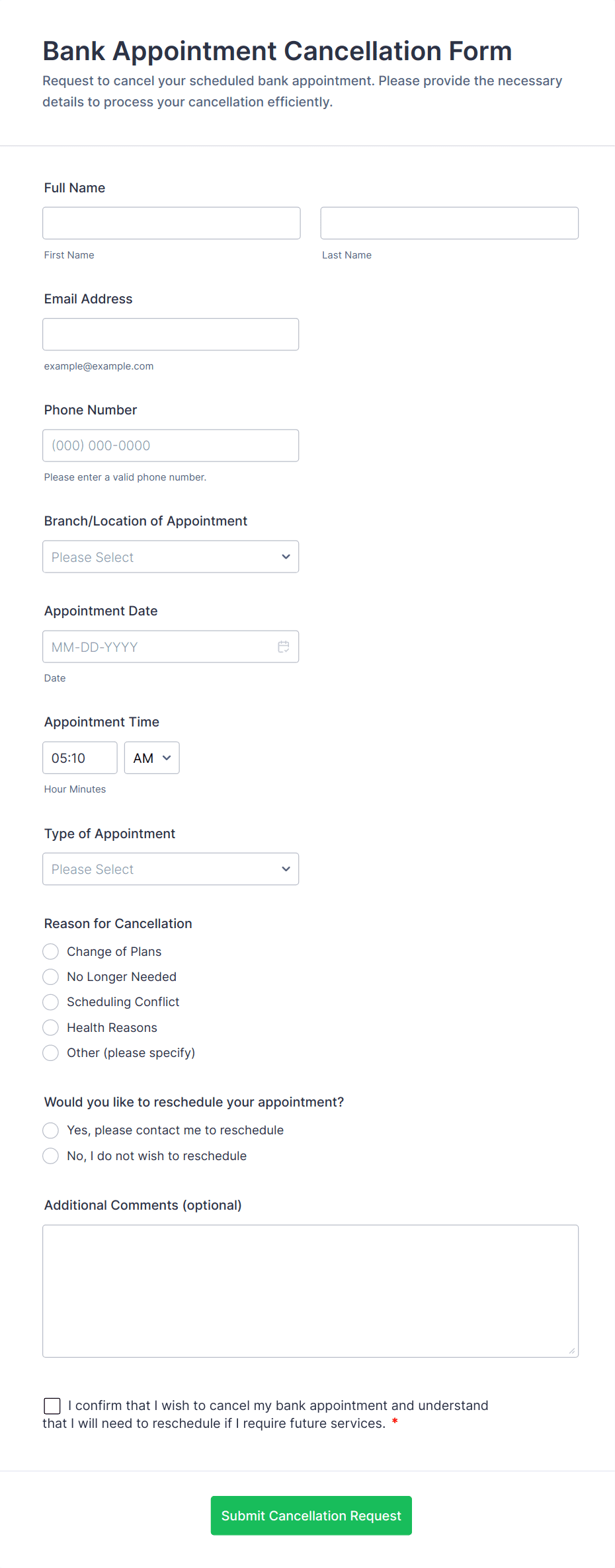 • For payment-related cancellations, include fields for refund preferences or payment details.