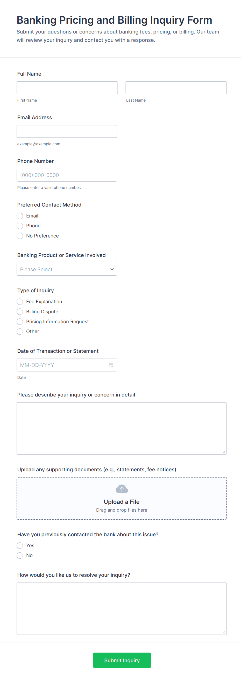 A banking form template is a pre-designed digital form used by financial institutions to collect, process, and manage information related to banking services, such as account openings, loan applications, and compliance checks.