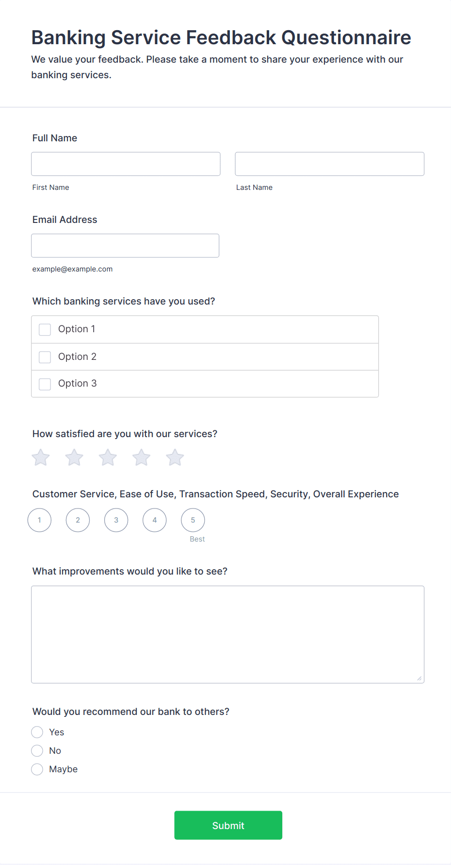 • Product feedback forms may include questions about usability, features, and likelihood to recommend.