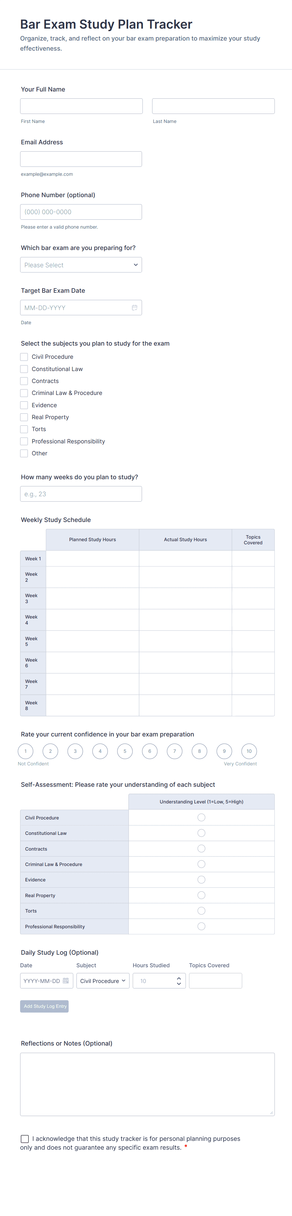 The form templates here are for informational purposes only. Jotform is not providing legal, financial, or other advice, or implying that the forms are legally valid in all or any jurisdictions. Before using any such form, consult an attorney and/or other applicable professionals to make sure that the form meets your needs, legally and otherwise.