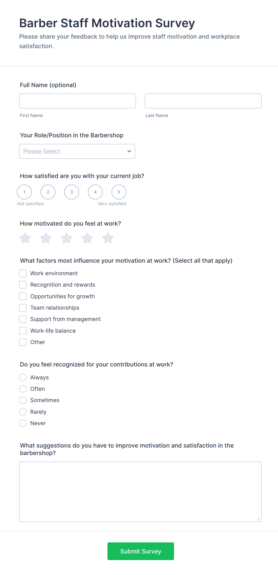 • For onboarding or exit surveys, add fields about the hiring process, training, or reasons for leaving.