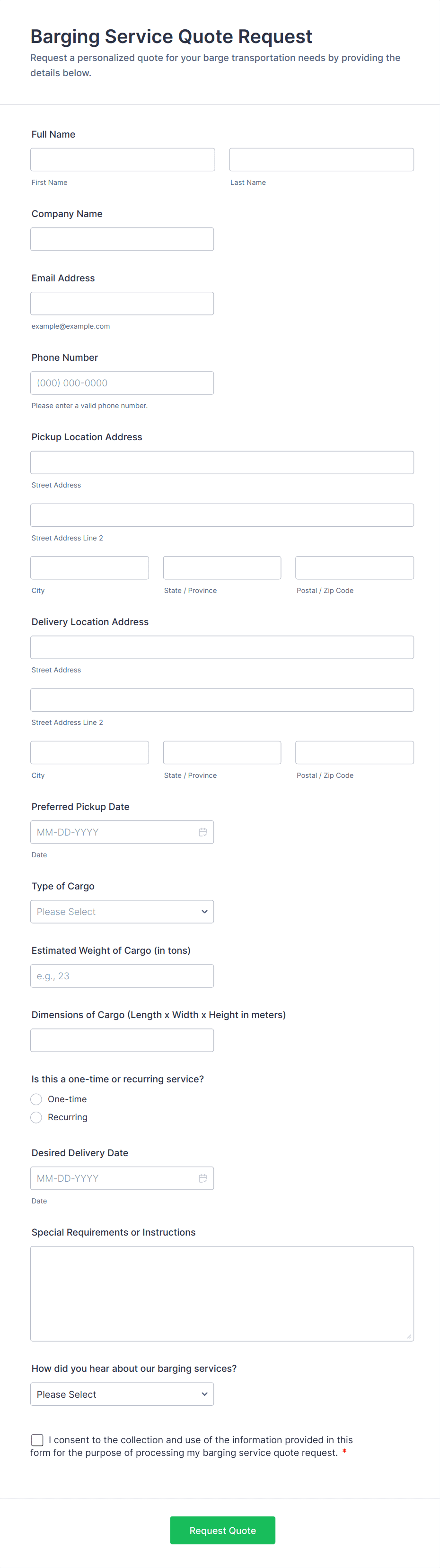 Quote forms are specialized online forms designed to collect information from customers or clients seeking a price estimate for products or services. These forms are commonly used by businesses in industries such as insurance, construction, event planning, logistics, and professional services, where pricing can vary based on specific requirements. By gathering essential details—such as project scope, service preferences, quantities, and contact information—quote forms enable businesses to provide accurate, tailored quotes efficiently. They streamline the initial inquiry process, reduce back-and-forth communication, and help both parties set clear expectations from the outset.