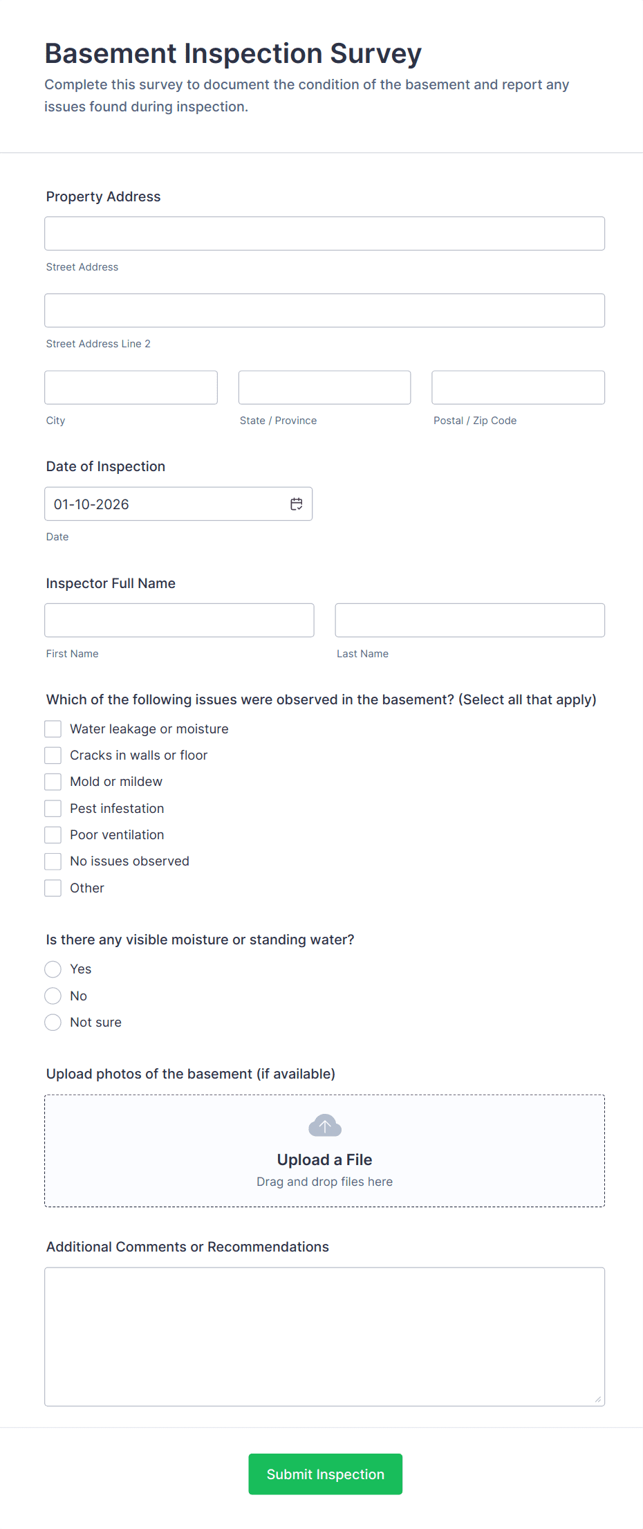 Field Inspection Form Templates are specialized digital forms designed to streamline the process of collecting, recording, and managing inspection data in various field environments. These templates are commonly used by professionals in industries such as construction, real estate, facility management, agriculture, environmental services, and safety compliance. They help inspectors document site conditions, equipment status, safety hazards, maintenance needs, and regulatory compliance during on-site visits. By standardizing the inspection process, these templates ensure that all necessary information is captured accurately and efficiently, reducing the risk of oversight and improving reporting consistency.