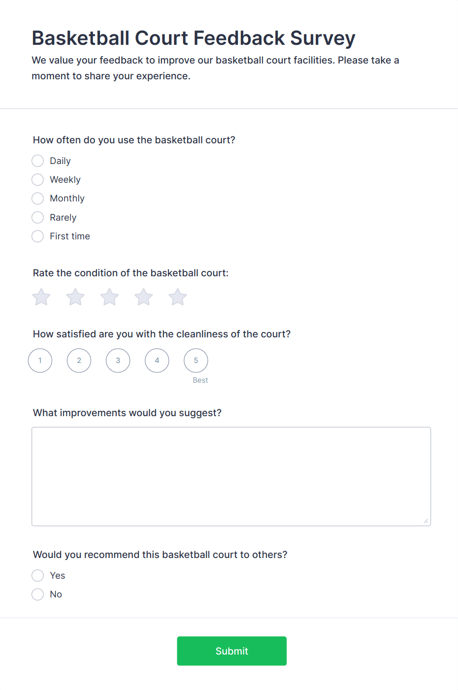 • Product feedback forms may include questions about usability, features, and likelihood to recommend.
