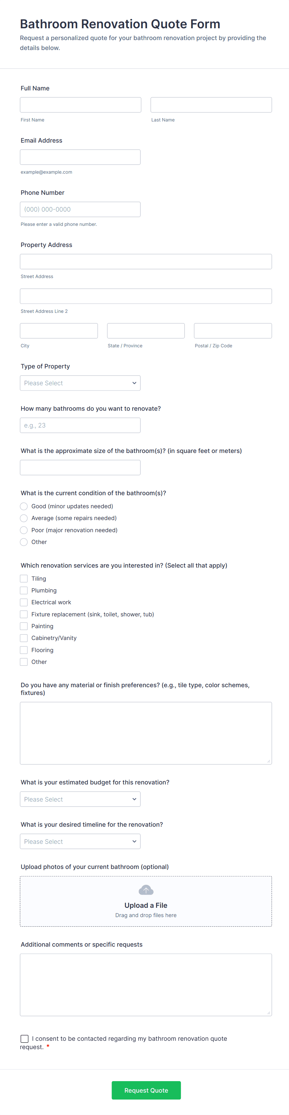 - Trade-specific construction quote forms prioritize detailed specs for the selected service (roofing area, electrical scope, plumbing fixtures), material preferences, and permit or compliance requirements.