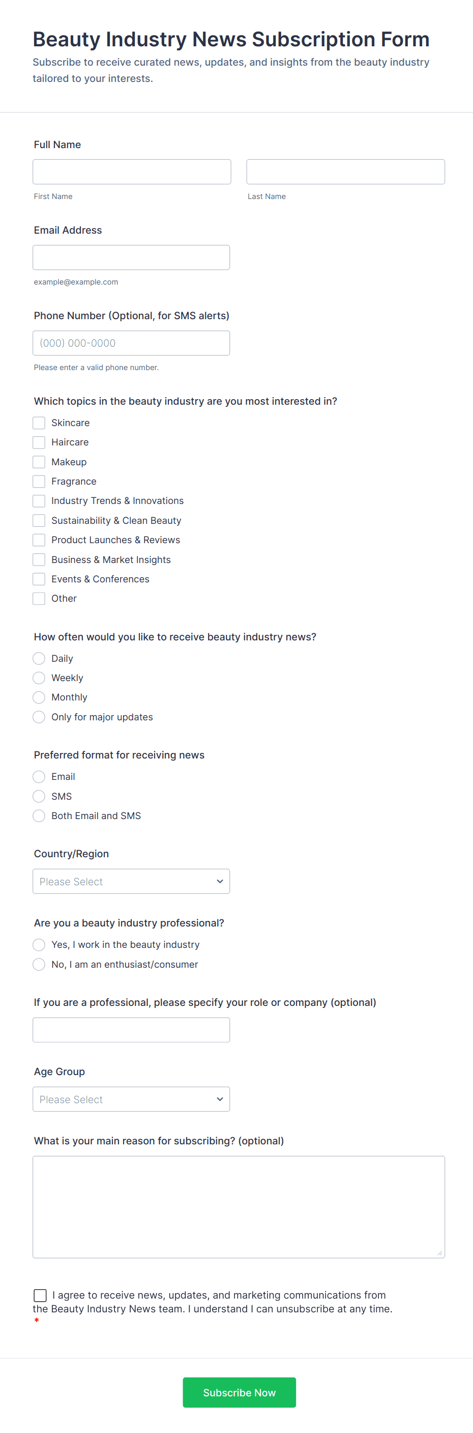 A subscription form is an online form used to collect information from individuals who wish to sign up for recurring services, communications, or memberships, such as newsletters, product deliveries, or club memberships.