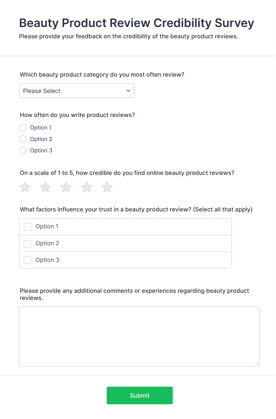 • Short and long text fields for open-ended feedback.