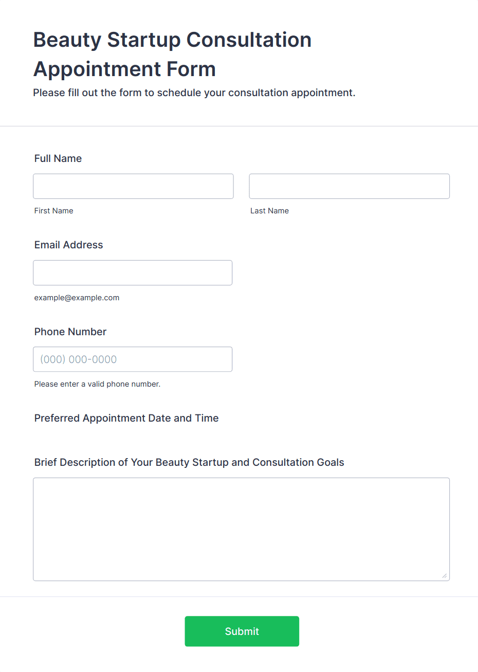 Appointment forms are digital tools designed to streamline the process of scheduling meetings, consultations, interviews, or any type of appointment between service providers and clients. These forms are commonly used by healthcare professionals, salons, educational institutions, consultants, and businesses that require organized time management for their services. By collecting essential information such as preferred dates, times, contact details, and specific service requests, appointment forms help reduce scheduling conflicts, minimize no-shows, and improve overall efficiency. Whether you’re managing a busy clinic, coordinating interviews, or booking personal training sessions, appointment forms provide a structured way to handle bookings and keep your calendar organized.