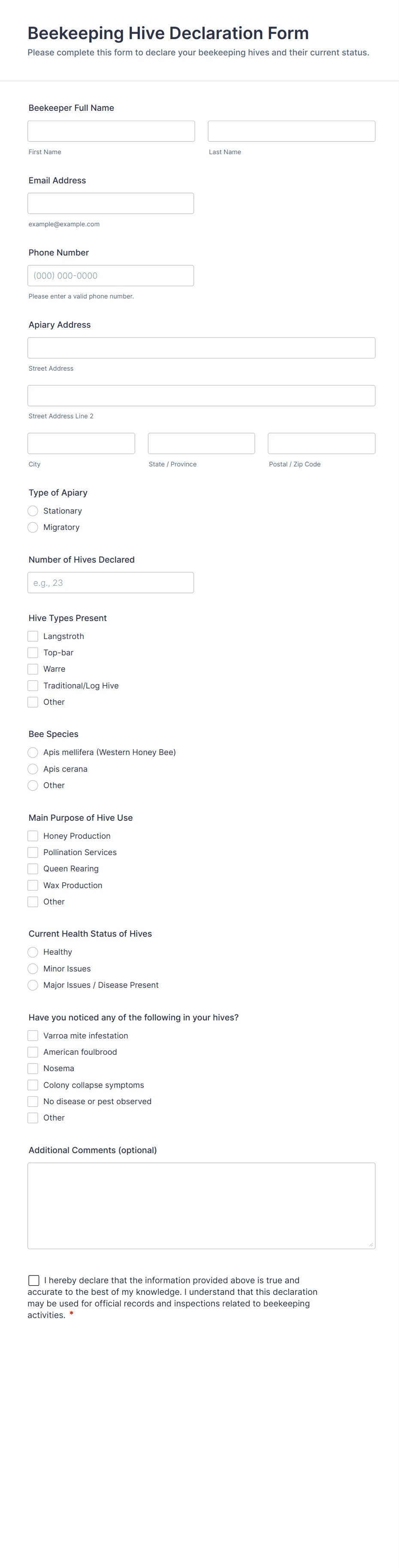 - For legal declarations, add detailed terms and conditions with mandatory agreement checkboxes.