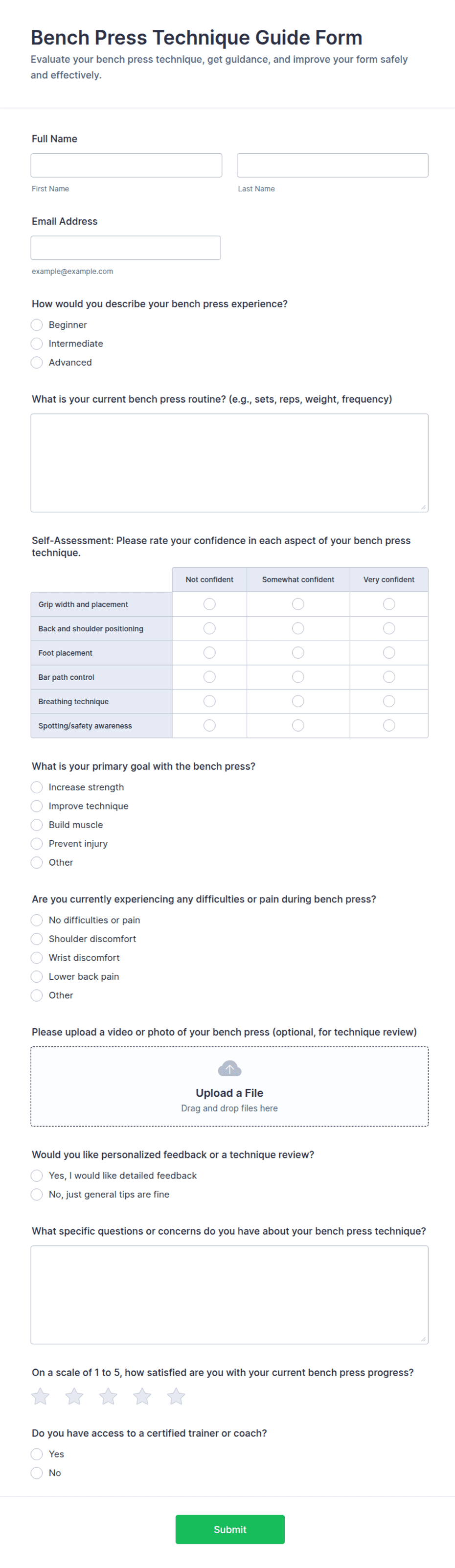 Personal Training Registration Questionnaire is a form template that efficiently collects vital client information like fitness goals, health history, and workout preferences, all in a user-friendly format provided by Jotform for seamless gym or personal training interactions.