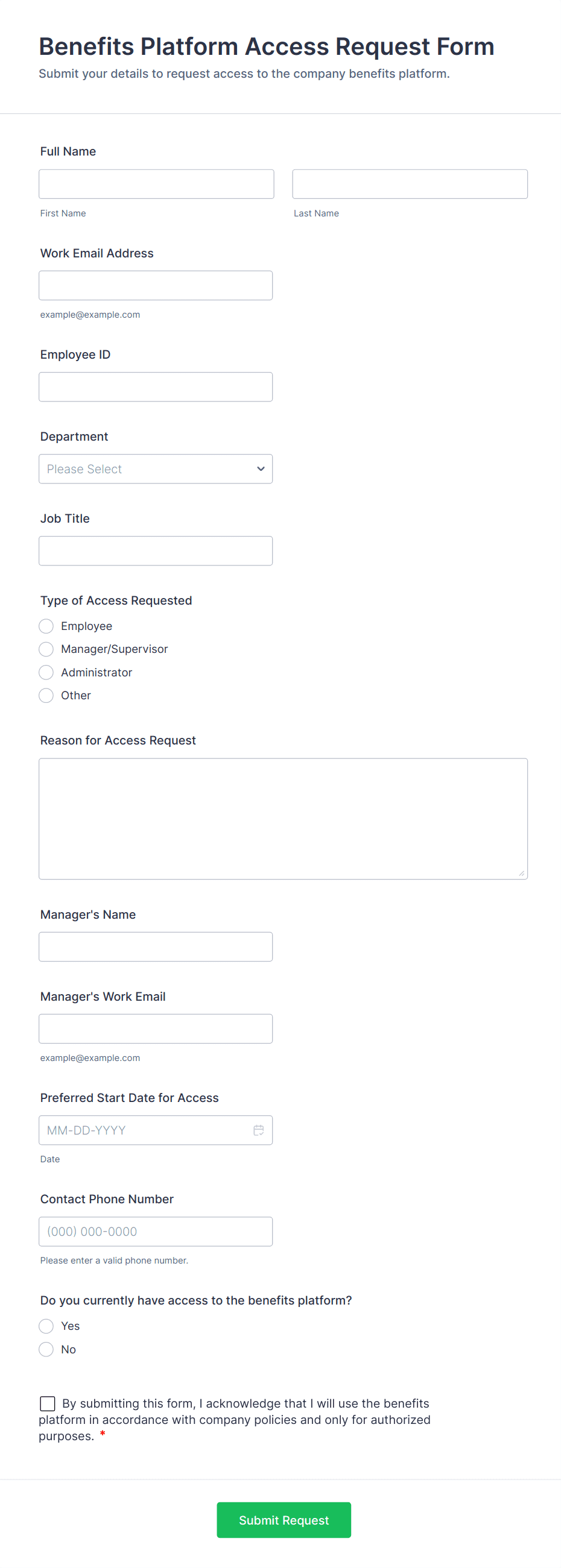 Collect and review employee access requests with the Authorized User Access Request Form, helping IT and managers approve system permissions, track time-bound access, and keep data collection organized in Jotform.