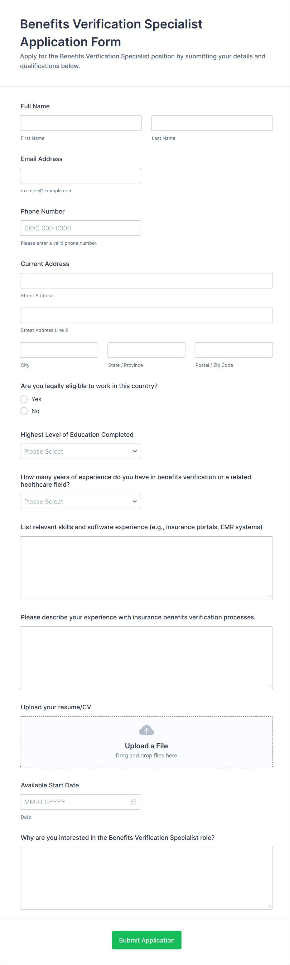 A simple Job Application Form which allows to collect personal and contact information, current employment status, desired position, available start date of the candidate, their resume and any other document.
