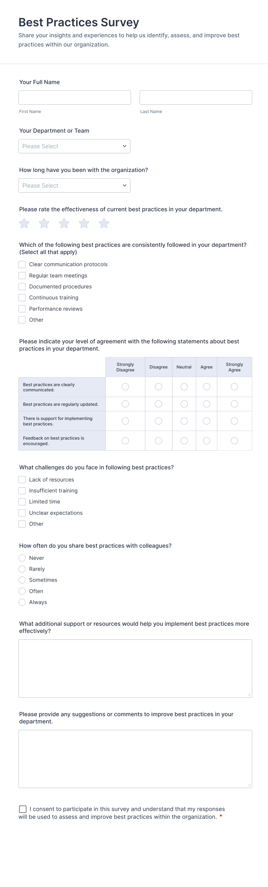 - Employee surveys might include Likert scales, training evaluation fields, and suggestions for process improvement.